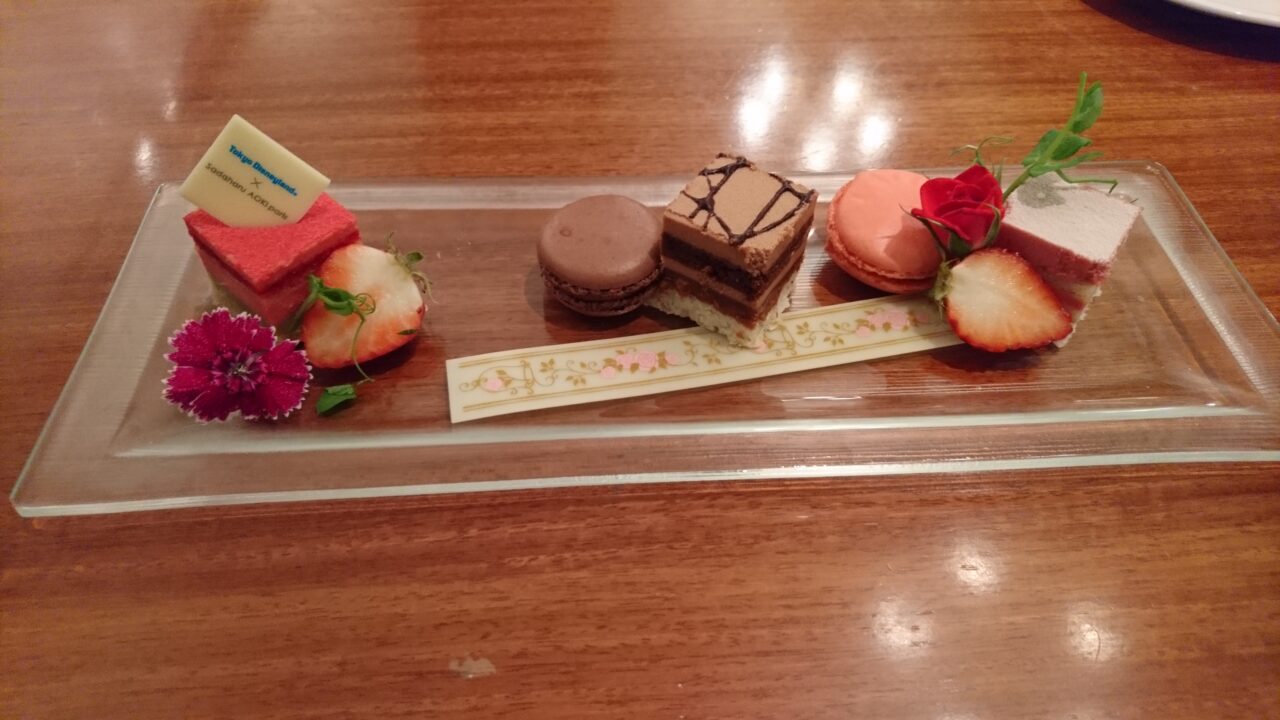 - デザート:サダハル・アオキ監修のデザートプレート (ストロベリー&ピスタチオ、ショコラプラリネ、ローズ&ルビーチョコレート)
