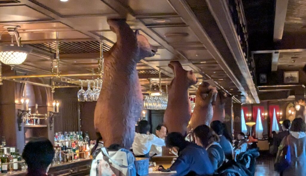 かつてルーズベルトがクマ狩りに出かけたところ、小熊を仕留めることを拒否した逸話があります。それが元で「テディベア」が誕生したと言われています。木彫りのクマたちは、まさにその逸話に敬意を表した装飾として、重厚なカウンターを力強く支えています。