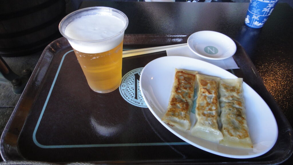 ↑焼きギョウザ、当時は陶器のお皿で提供、ビールにはNマークのコースター付