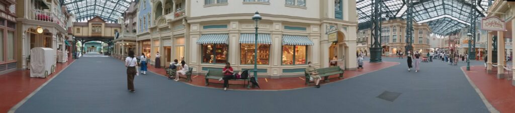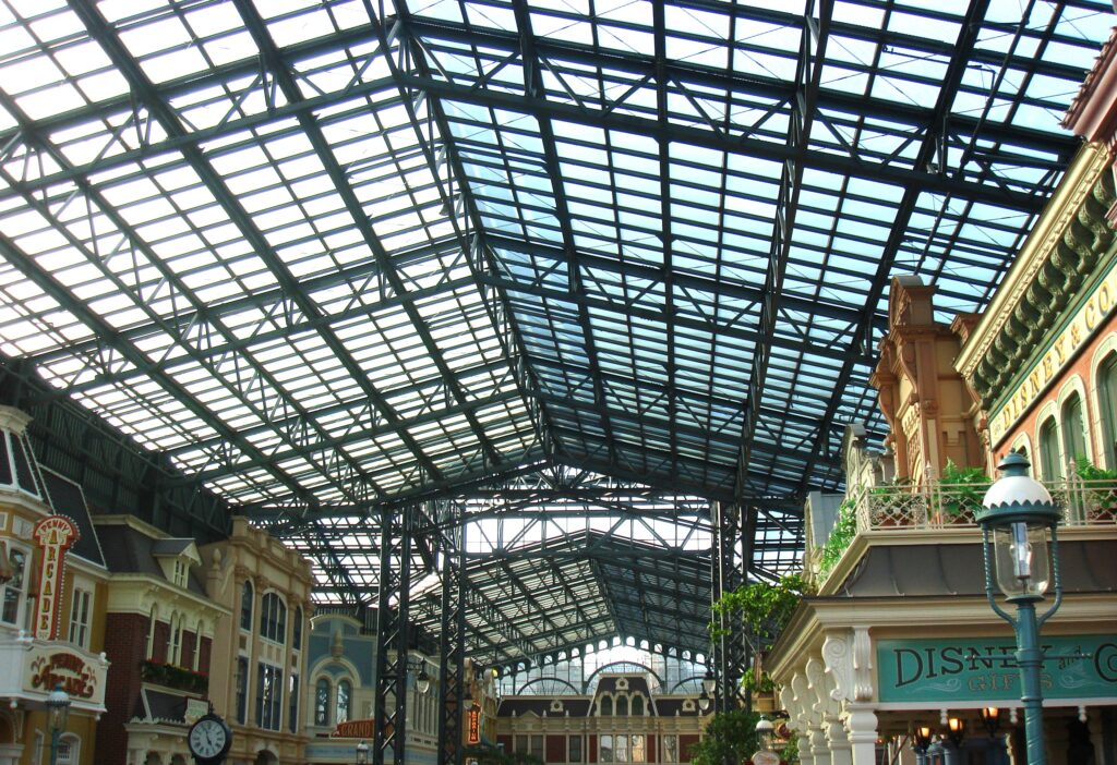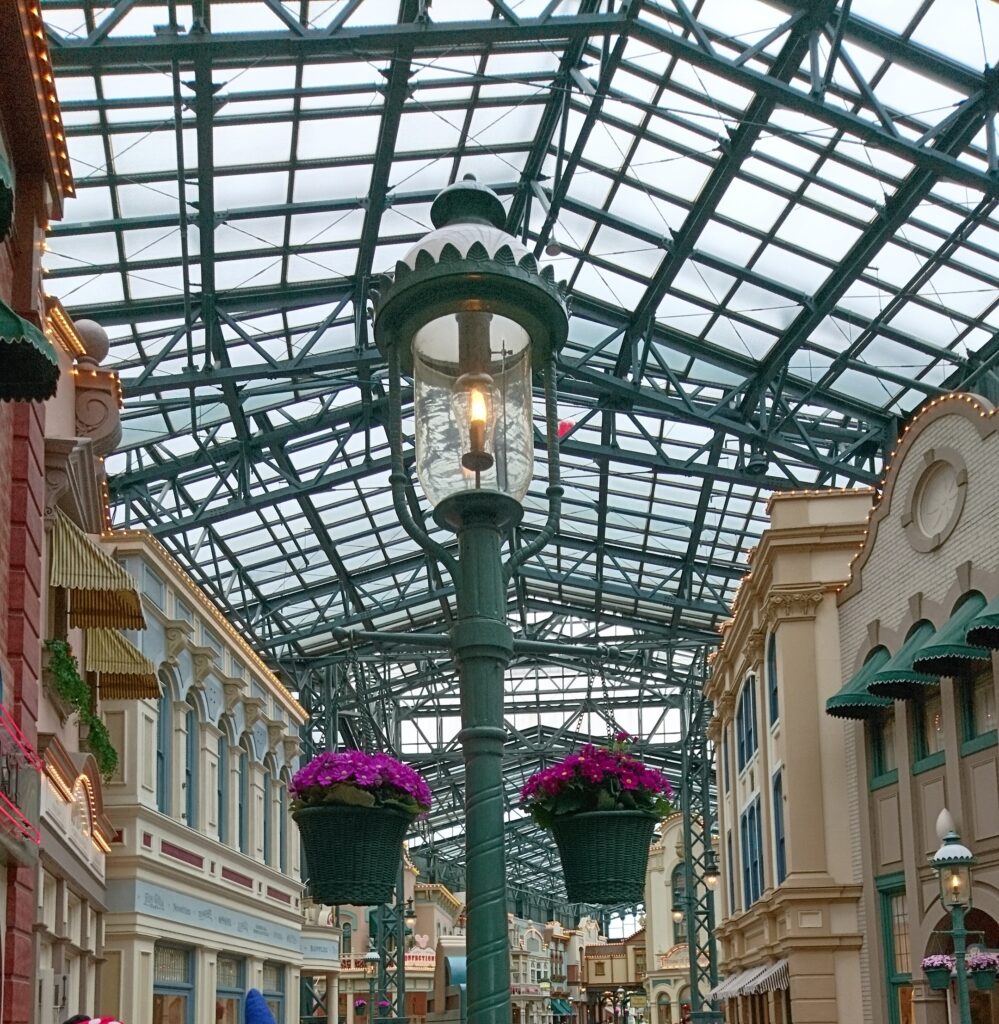 入園ゲートを抜けるとすぐ、ガラス張りの大きな屋根に覆われた通りが現れます。