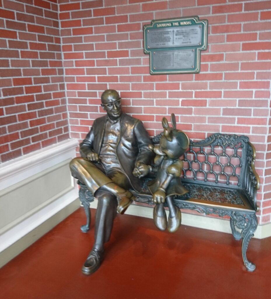 - 入口付近にはウォルトの兄、「ロイ・O(オリヴァー)・ディズニー」とミニーちゃんがベンチに座っている銅像があります。25周年記念として、本家ウォルト・ディズニー・カンパニーから寄贈されました。意外と気にしていないと通り過ぎてしまうポイントです。