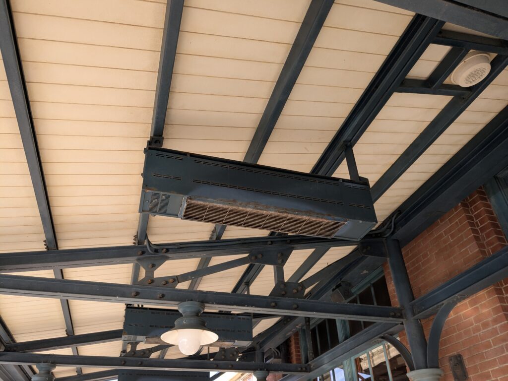 テラス席の屋根部分に吊り下げ式のヒーターが設置されており、