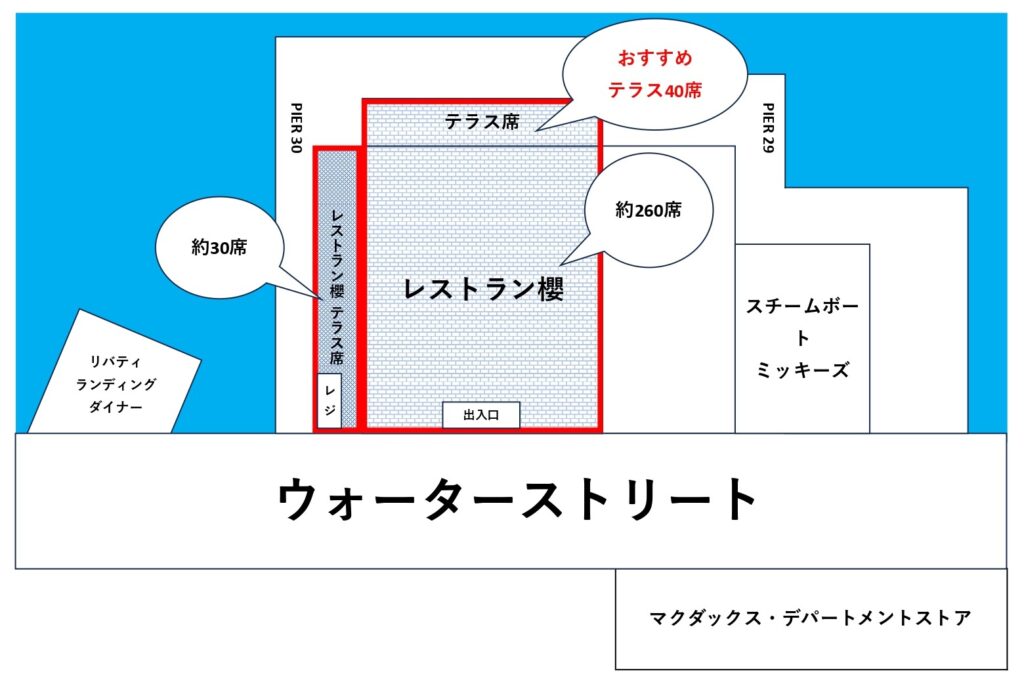 入店後、キャストさんに「テラス席を利用したい」と伝えれば、混雑していない限り準備出来次第、ご案内されると思います。※同じ名前の別店舗『レストラン櫻 テラス席』とは異なります。私がオススメしているのはレストラン櫻 ”の” テラス席です。
